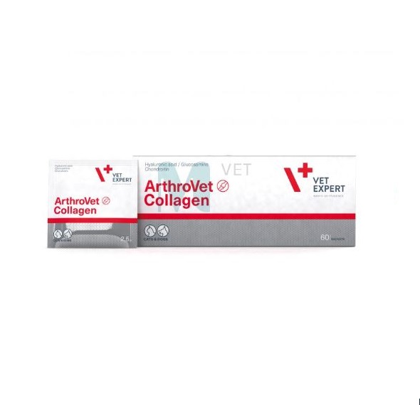 VetExpert ArthroVet Collagen. Täiendsööt koertele ja kassidele normaalse liigese ja liigesekõhre funktsiooni toetamiseks. Sobib kasutamiseks nii noortel loomadel kasvuperioodil kui vanematel loomadel. Koostis: kollageen. Lisatud söödalisandid (kotikese kohta): kolloidne räni 25 mg. Analüütiline koostis: toorproteiin 93,09%, toorõlid ja -rasvad 0%, toorkiud 0,41%, toortuhk 1,04%, niiskus 5,46% Kasutamine: koertele 1 kotike 20 kg kehamassi kohta päevas, võib segada toidu hulka. Kassidele pool kotikest päevas. Värske joogivesi peab olema alati saadaval. Säilitamine: kuivas kohas, kuni 20°C temperatuuril, kaitsta otsese päikesevalguse ja niiskuse eest. Hoida laste eest kättesaamatus kohas. Pakendi suurus: 60 kotikest Parim enne ja partii: vt. pakendilt. Tootja: VetPlanet Sp. zo.o, Poola