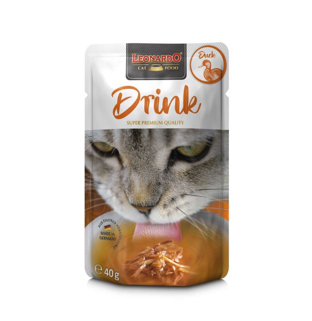 LEONARDO Drink puljong-konserv ahvatleb oma maitse ja lõhna tõttu kassi jooma. Piisav vee tarbimine toetab kassi kuseteede tervist.